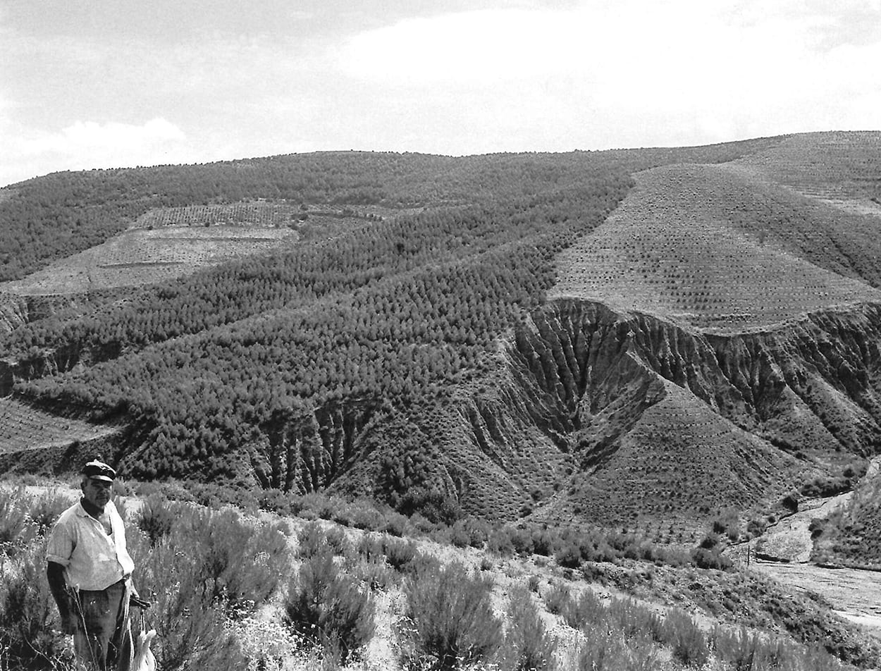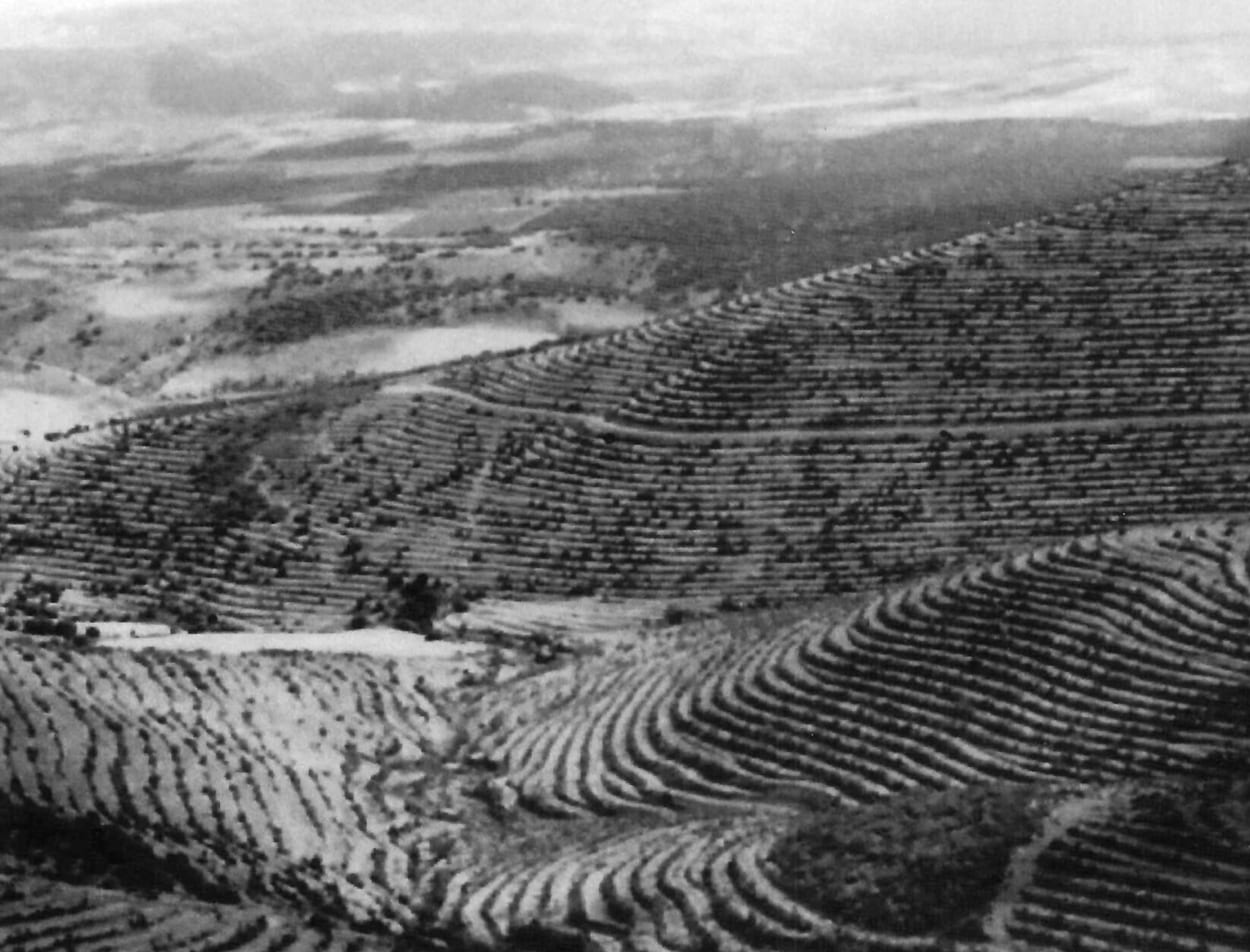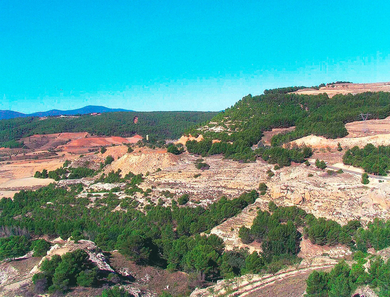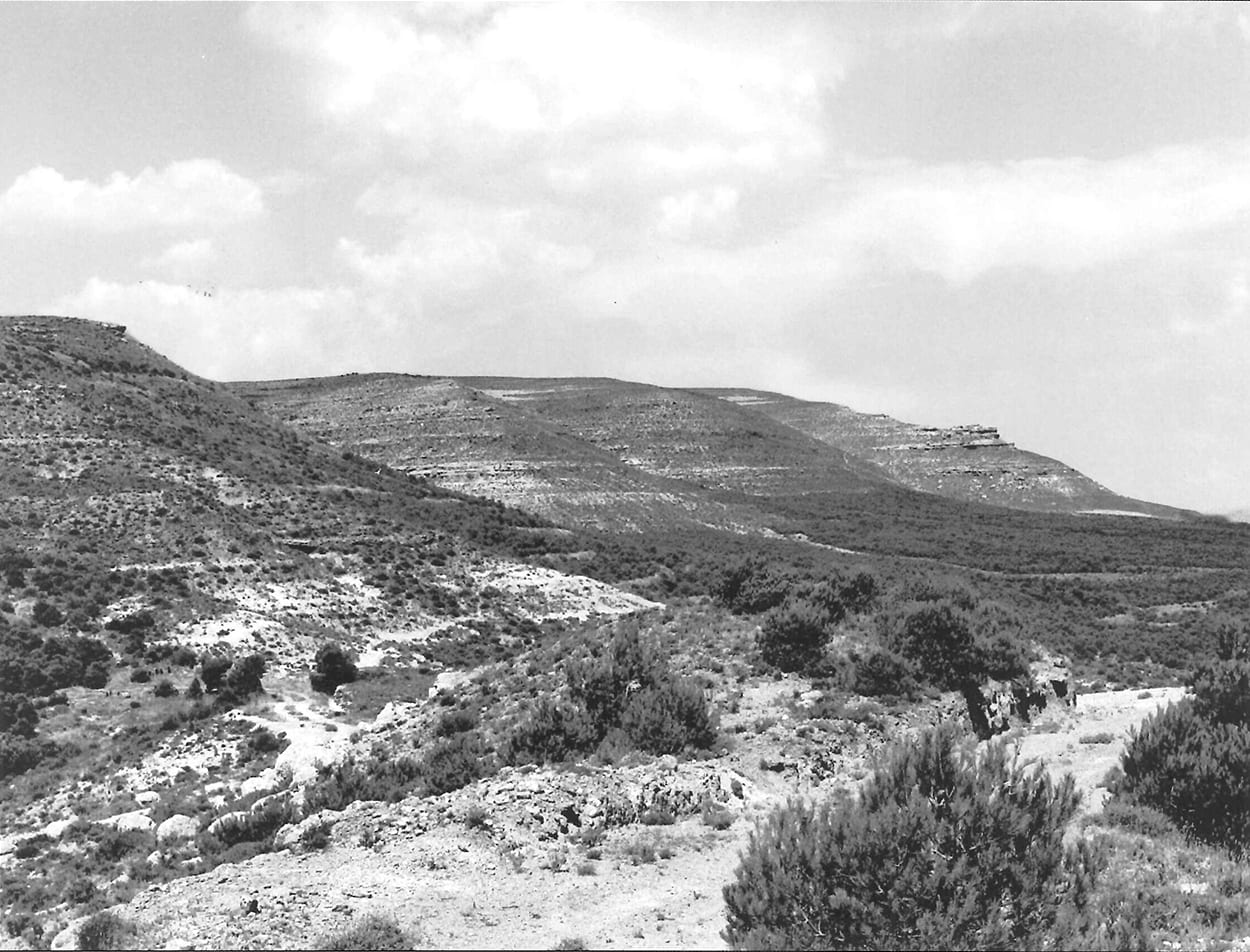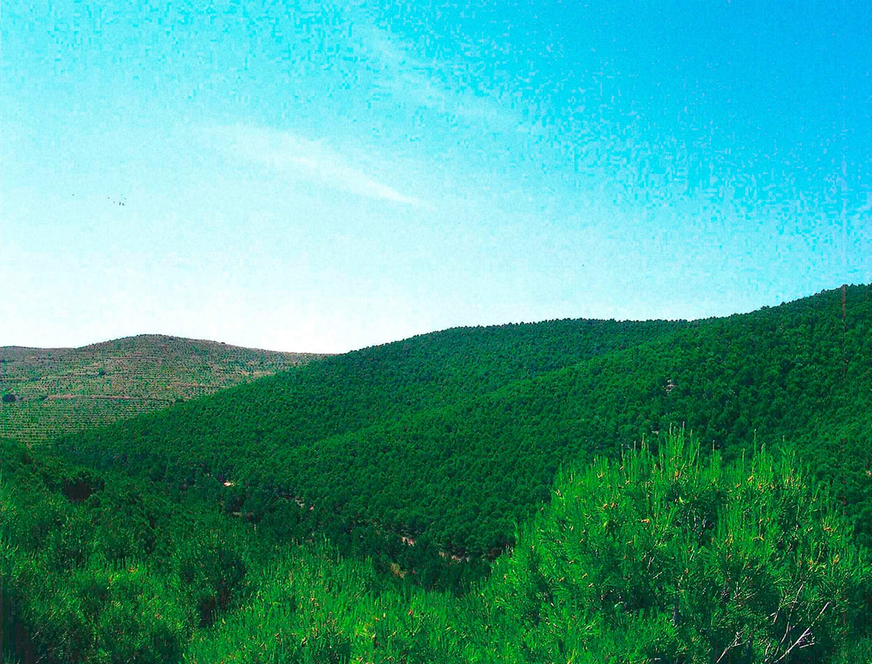 A la izquierda de la foto monte Valda y Carrilanga de Daroca. A la derecha y primer término monte Valmayor, Z-3.098 de Retascón. Suelos calizo-arcillosos. Preparación mediante banquetas hechas con bueyes con tres surcos de brabant y una pasada de subsolador, plantadas en los años 1958 a 1960 con planta de los viveros de Ricla y Calatayud. Al fondo a la izquierda Dehesa de los Enebrales.