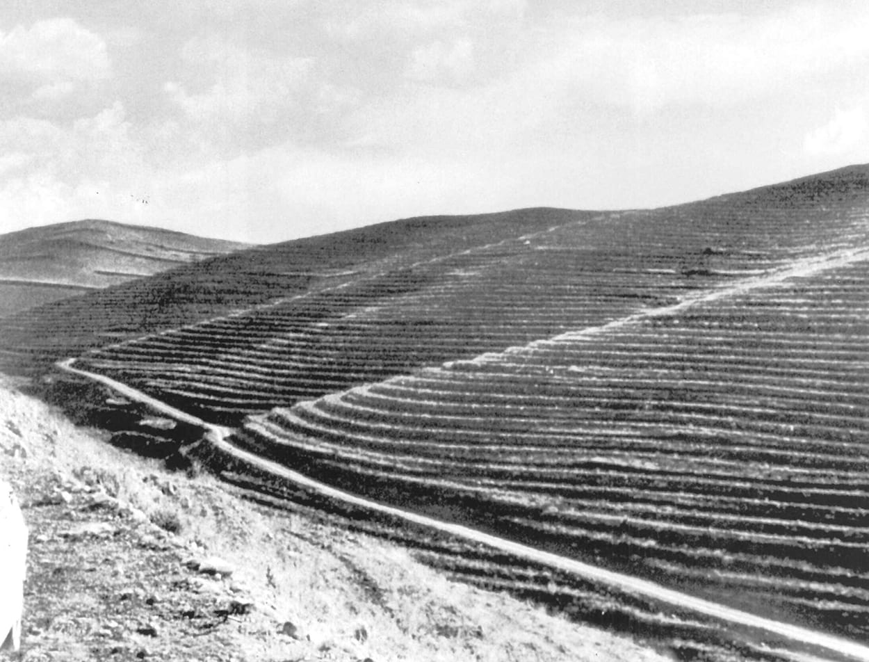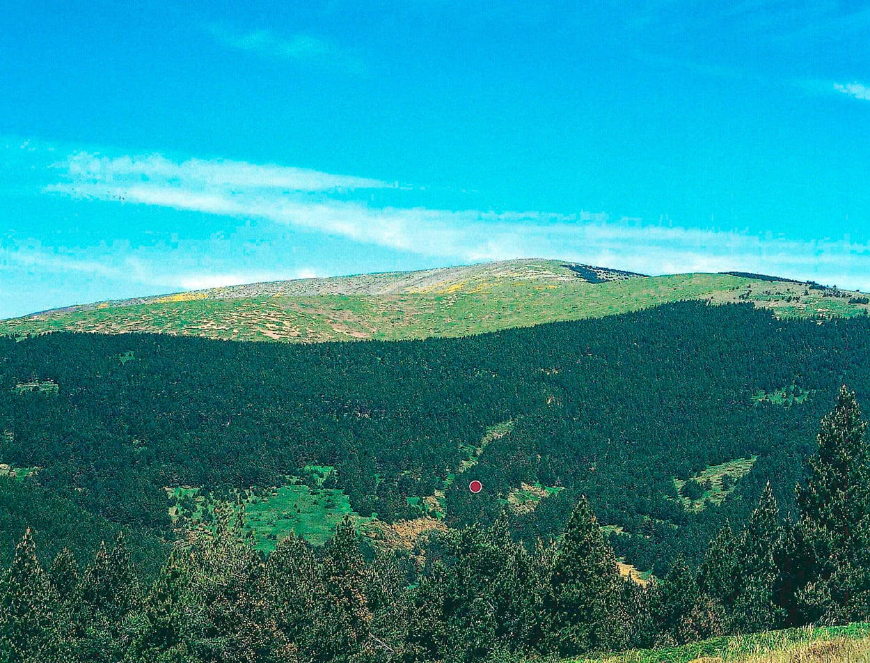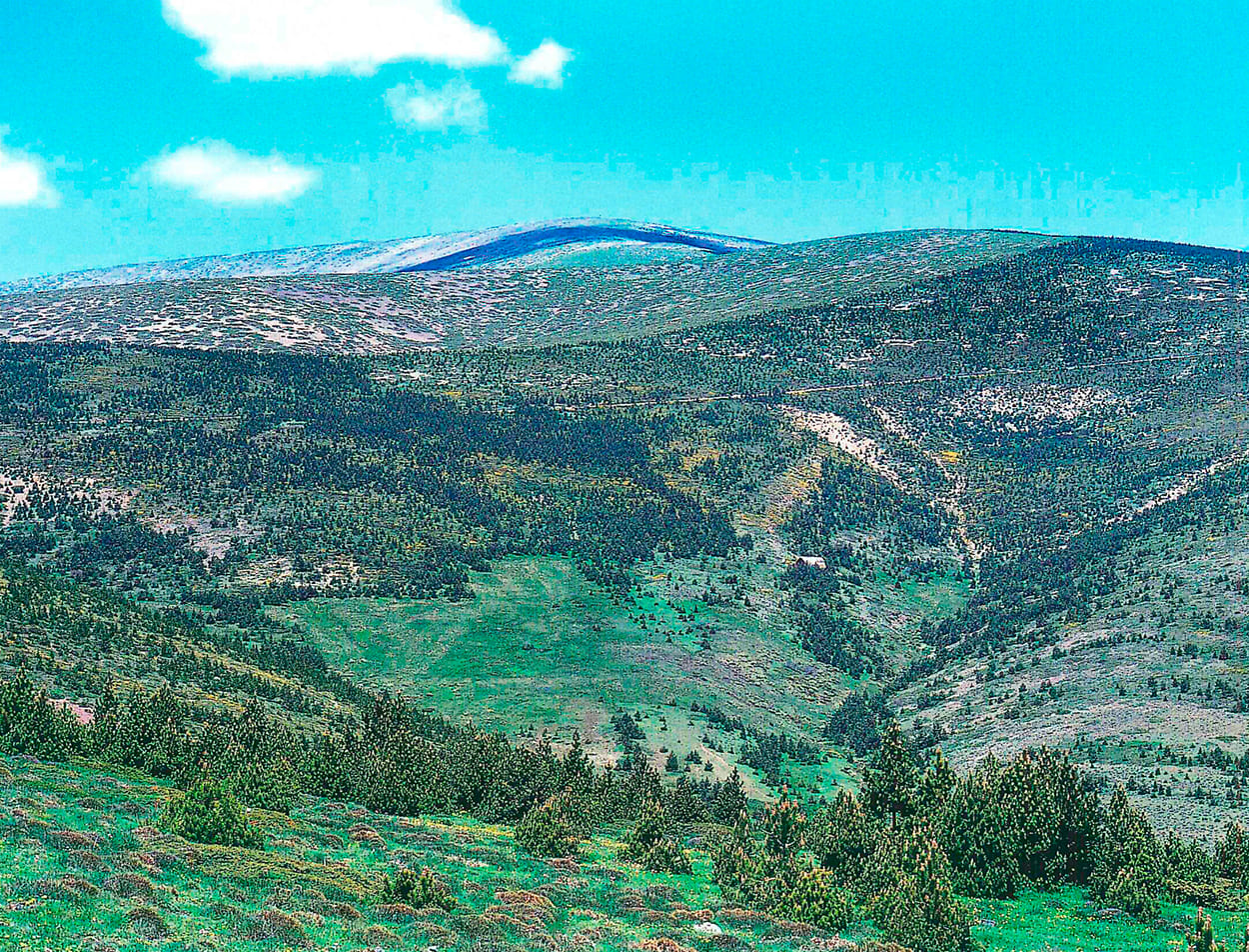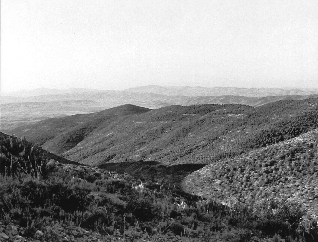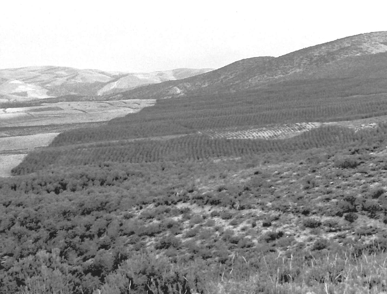 A la izquierda de la foto monte Valda y Carrilanga de Daroca. A la derecha y primer término monte Valmayor, Z-3.098 de Retascón. Suelos calizo-arcillosos. Preparación mediante banquetas hechas con bueyes con tres surcos de brabant y una pasada de subsolador, plantadas en los años 1958 a 1960 con planta de los viveros de Ricla y Calatayud. Al fondo a la izquierda Dehesa de los Enebrales.