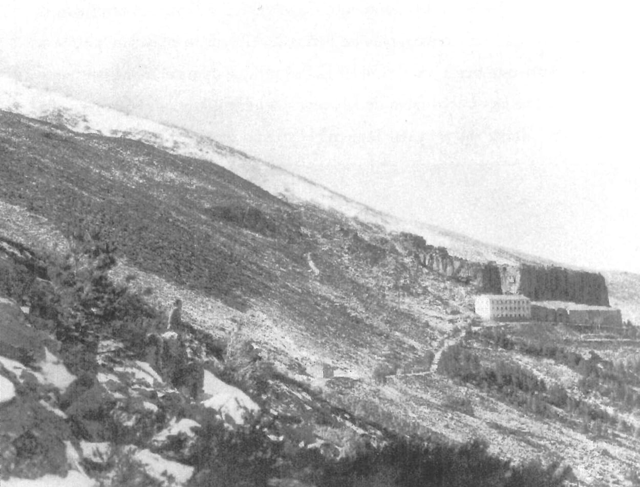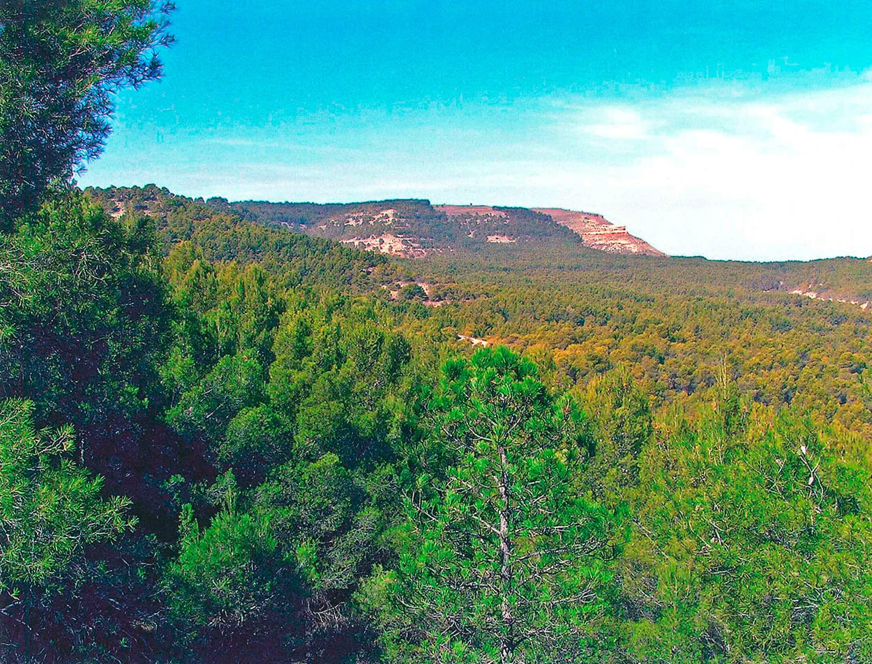 Monte con el arbolado muy irregular sobre terrenos detríticos calizo-arcillosos del Mioceno. Preparación: hoyos a mano, repoblado a partir de 1946. La repoblación sufrió ataques: de procesionaria y muchas marras por falta de suelo, sobre todo en primer plano de la foto. En la actualidad aquellos arboles achaparrados van creciendo con dificultad. La vaguada de la izquierda queda difuminada por el arbolado en la foto actual.
