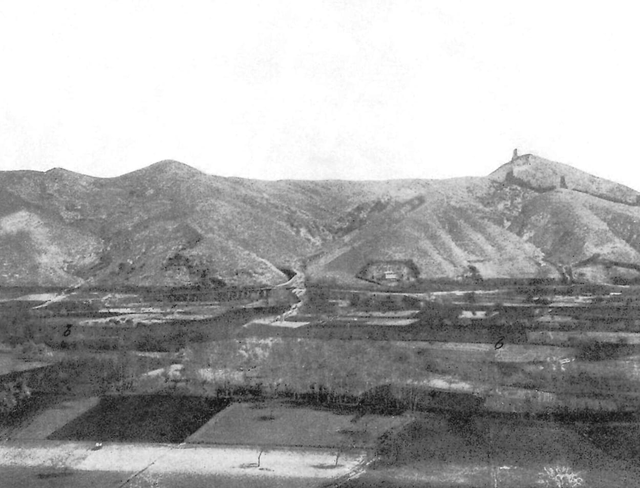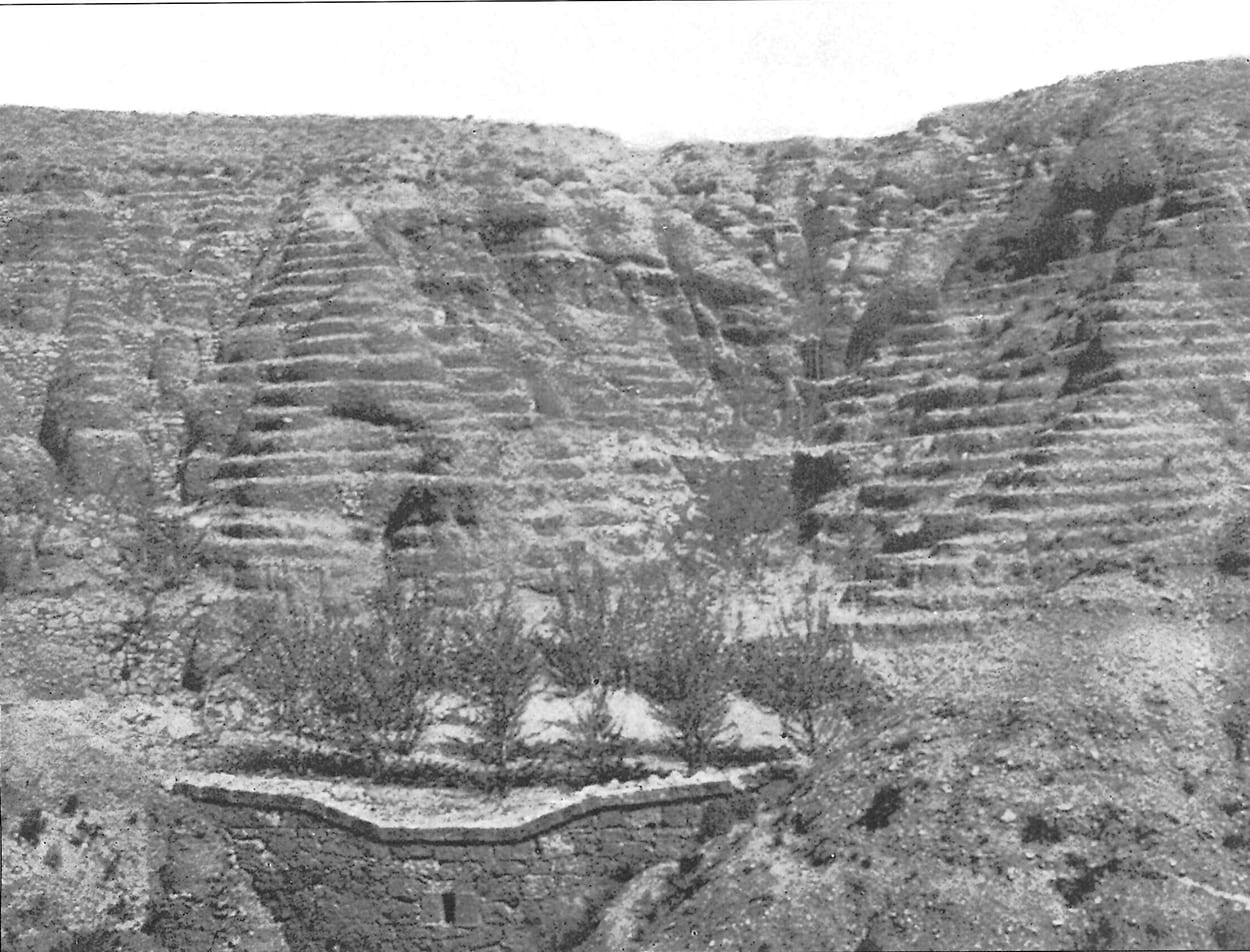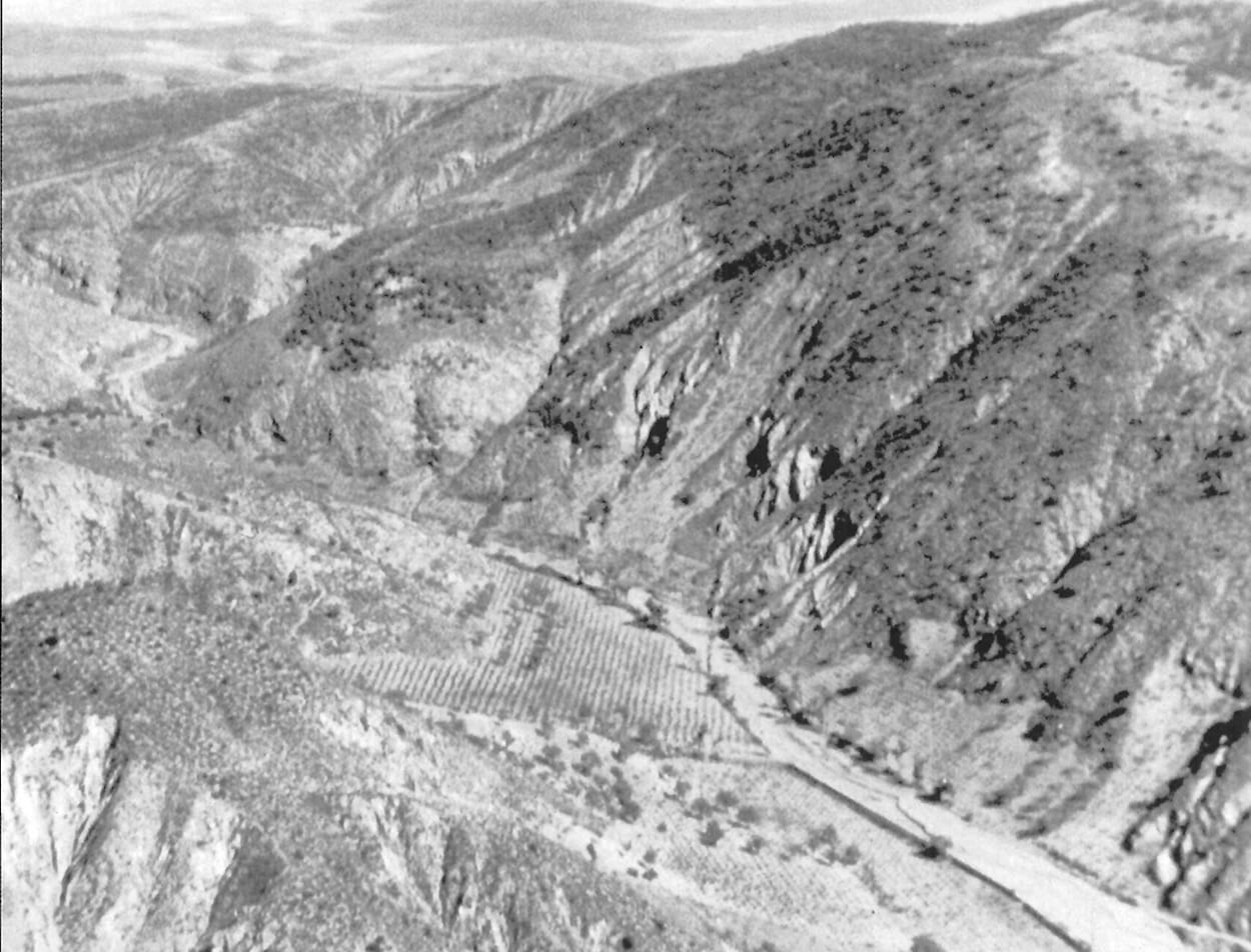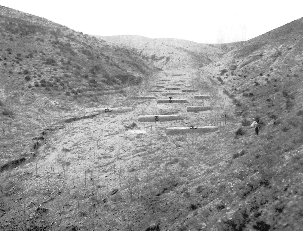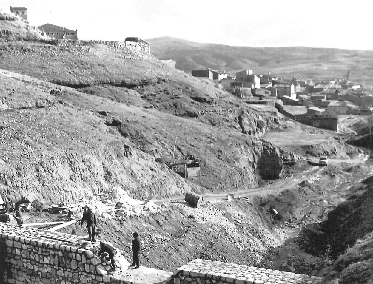 Vista aguas arriba de un dique en el barranco de Valdosat durante su construcción. Al fondo a la derecha el pueblo de Ibdes. En la actualidad el dique y con cubierta vegetal, protegiendo de avenidas una calle central del pueblo. está aterrado en parte y con cubierta vegetal, protegiendo de avenidas una calle central del pueblo.